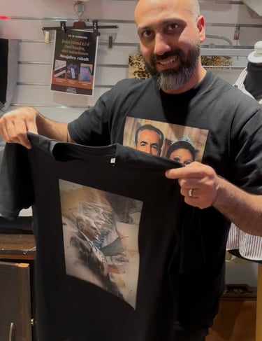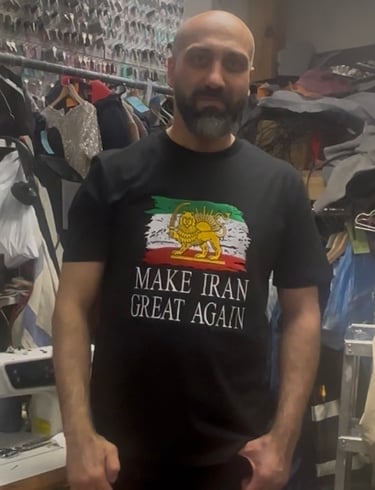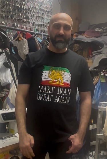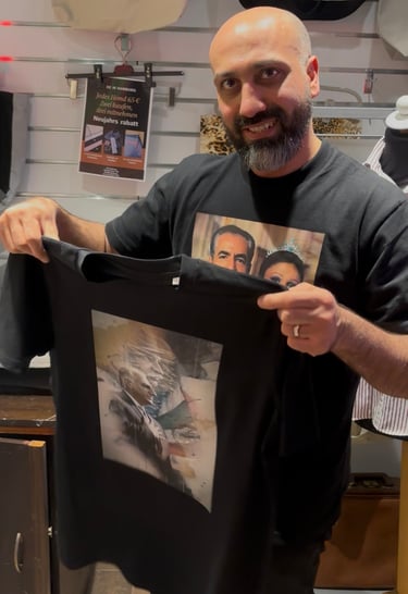 A happy customer wearing an embroidered shirt from Shir o Khorshid, smiling in a cozy urban setting.